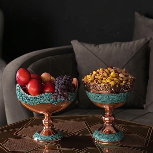 شیرینی خوری یا میوه خوری پایه دار سوپر بزرگ 65 سانتی مس و فیروزه کوبی نیشابور صنایع دستی سایروس