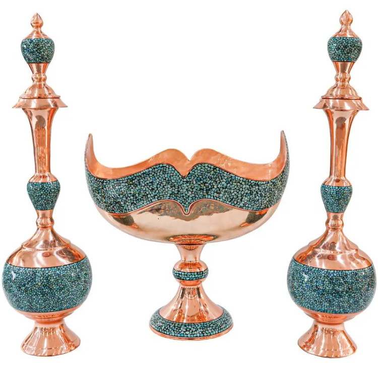ست سه تکه تنگ گیلاسی و کشکول فیروزه کوبی 20 سانتی مس و فیروزه کوبی نیشابور صنایع دستی سایروس