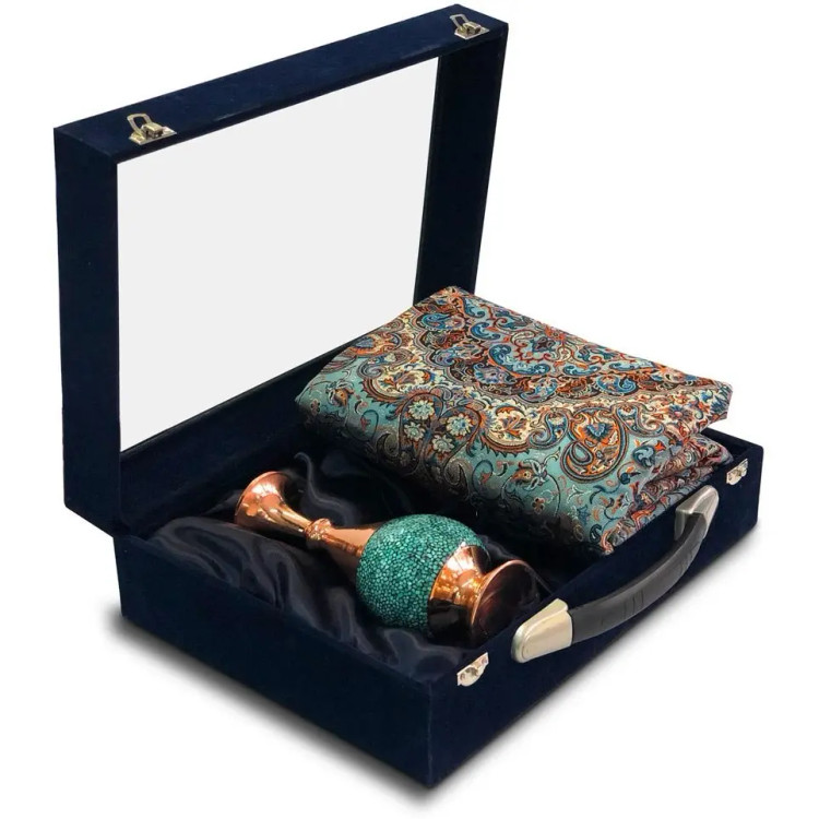 ست هدیه گلدان فیروزه کوبی و پارچه ترمه و جعبه جیر. هدیه و کادویی مس و فیروزه کوبی هدیه سازمانی صنایع دستی سایروس