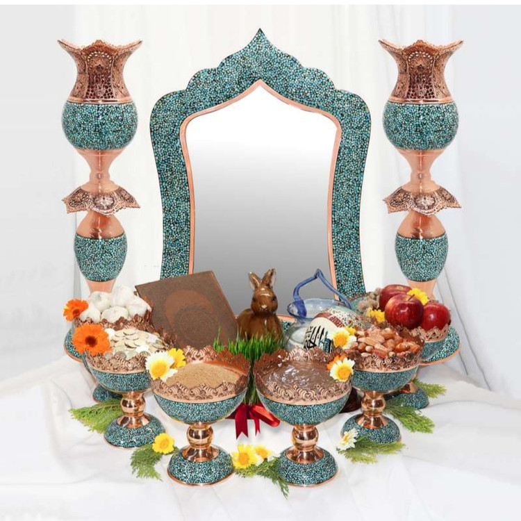 ست هفت سین فیروزه کوبی هفت سین عید نوروز مس و فیروزه کوبی نیشابور ست هفت سین صنایع دستی سایروس