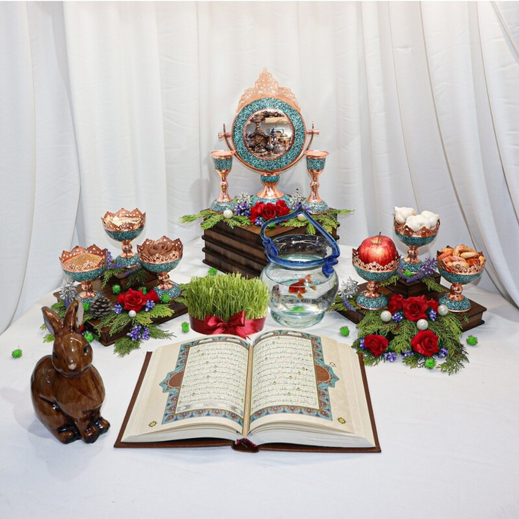 هفت سین فیروزه کوبی نیشابور هفت سین عید نوروز فیروزه کوبی هفت سین مس و فیروزه کوبی هفت سین صنایع دستی سایروس