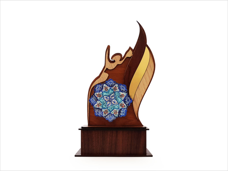 اندازه: 23 سانت ارتفاع تندیس و 8 سانت قطر بشقاب مینا کاری